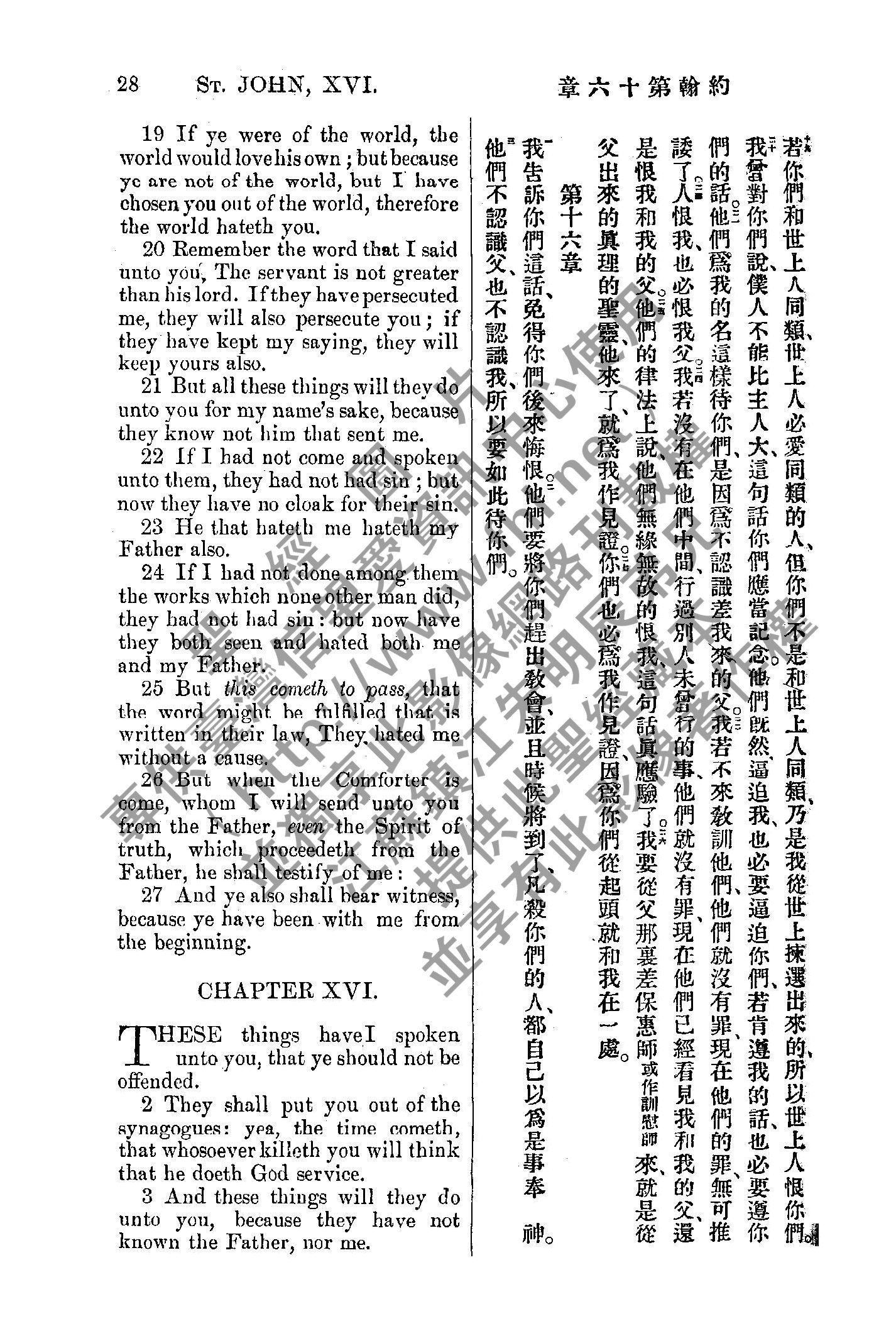 1885年新約全書 約翰福音 15 章 19 節到 16 章 4 節