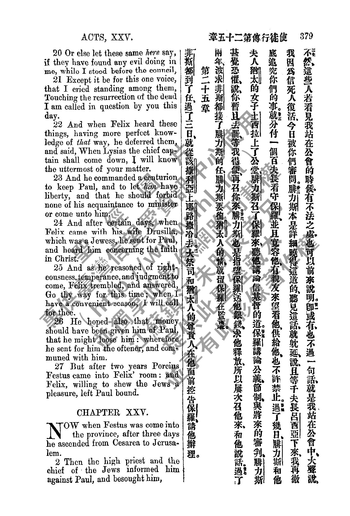 1885年新約全書 使徒行傳 25 章 20 節到 26 章 2 節
