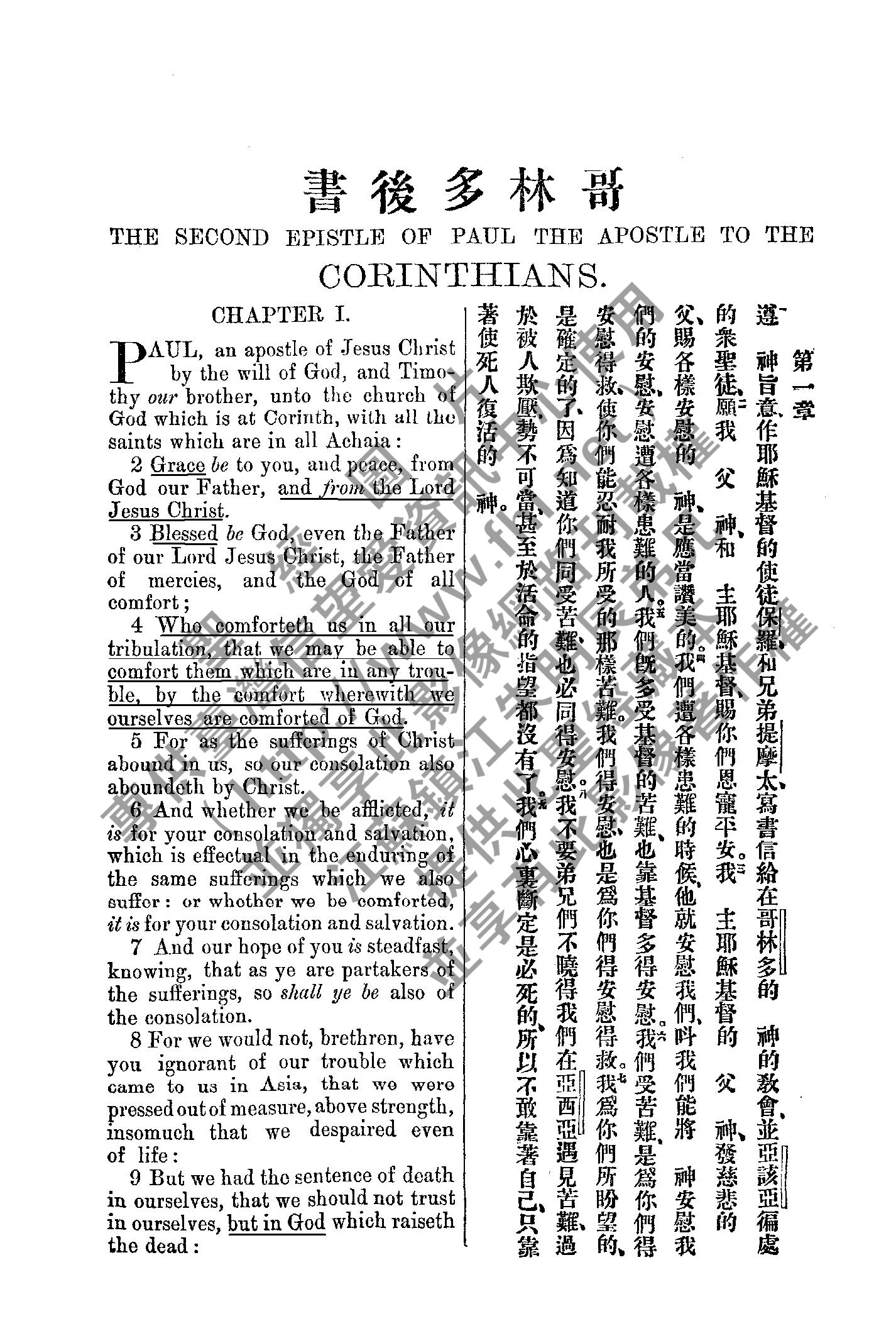 1885年新約全書 哥林多後書 1 章 1 節到 1 章 9 節