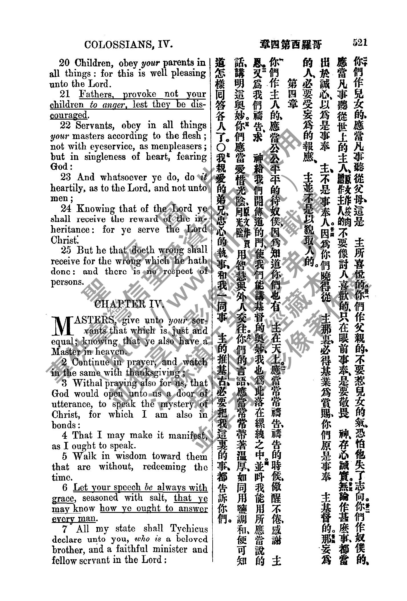 1885年新約全書 歌羅西書 3 章 20 節到 4 章 7 節