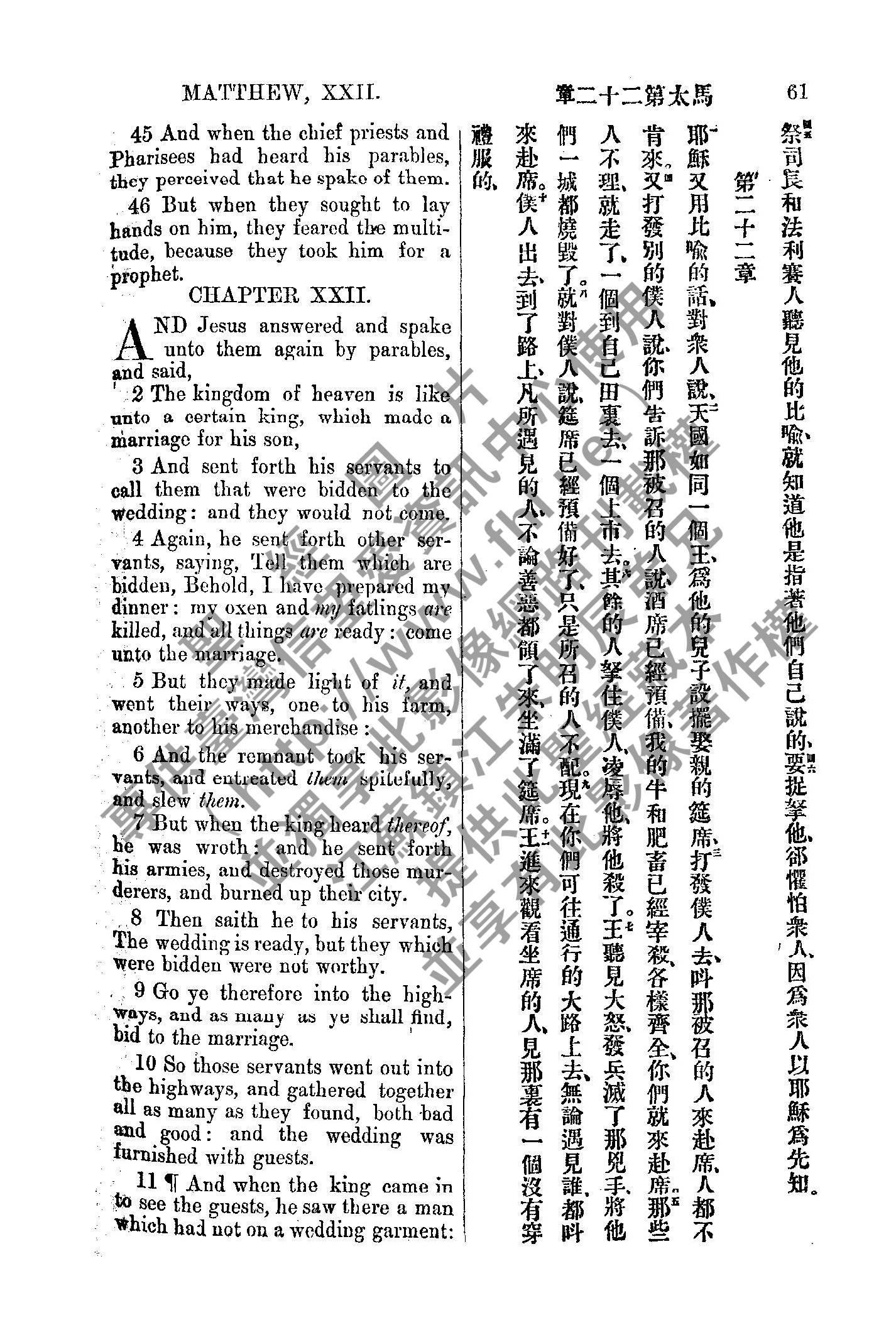 1885年新約全書 馬太福音 21 章 45 節到 22 章 11 節