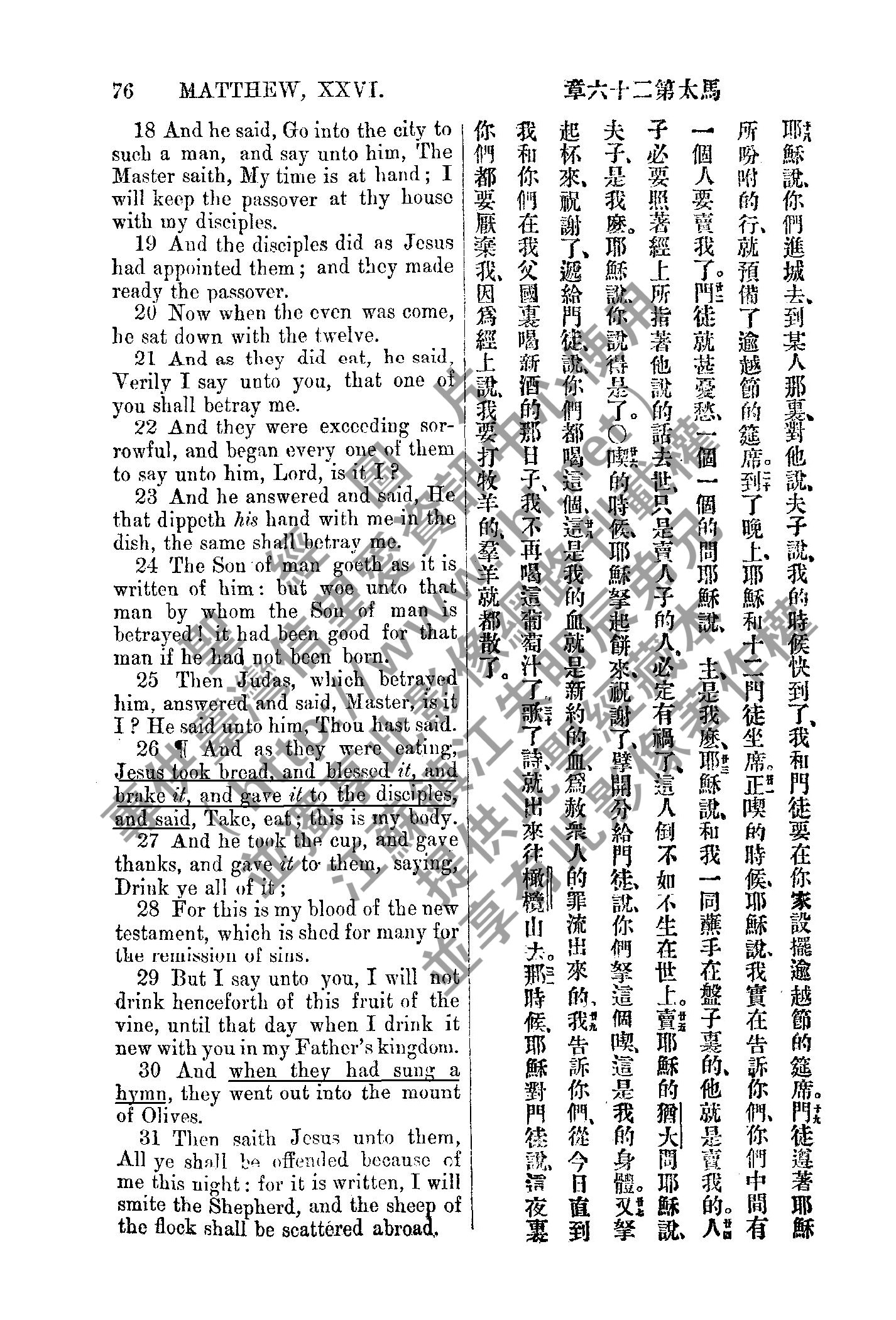 1885年新約全書 馬太福音 26 章 18 節到 26 章 31 節